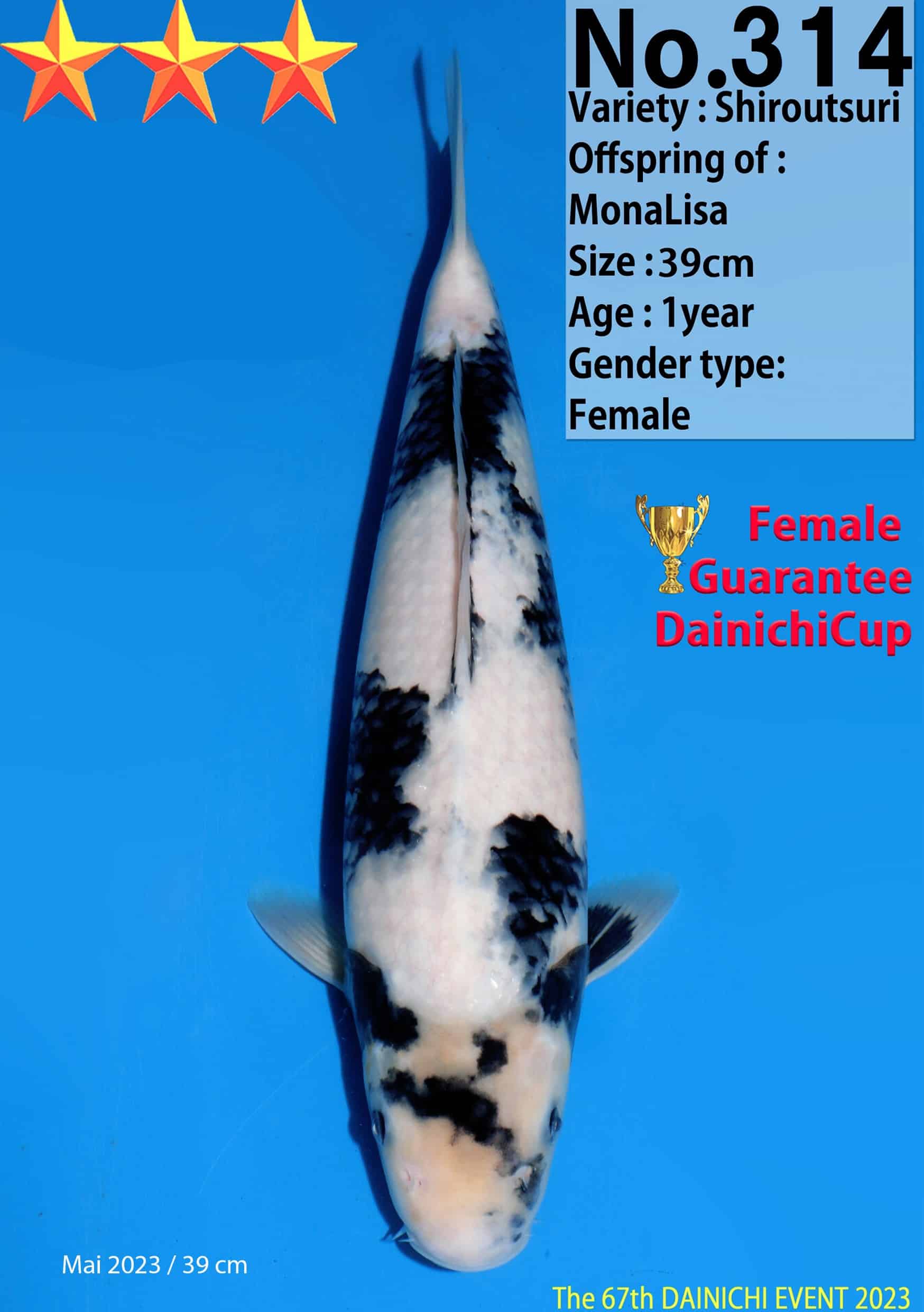 Gezüchtet von der Dainichi Koifarm, einem der bekanntesten Koi-Züchter weltweit, gehört dieser Koi zur Monalisa Blutlinie. Diese Blutlinie ist für Koi bekannt, die nicht nur eine einzigartige Farbbrillanz aufweisen, sondern auch für ihre starke Körperstruktur und ihre Langlebigkeit geschätzt werden. Shiroutsuri aus der Monalisa-Linie gehören zu den begehrtesten Koi, da sie für ihre außergewöhnliche Zeichnung und ihre anmutige Präsenz berühmt sind.